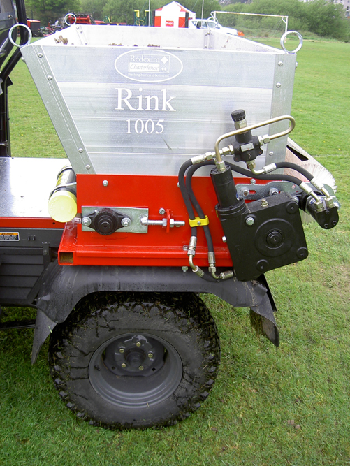 Der RINK GS 1010, mit einem Ladevolumen von 0,75m3und einer Streubreite von 1,5m, eignet sich ideal für das Ausbringen von Quarzsand, Gummigranulat auf Kunstrasenflächen, sowie zum Verfüllen von Kunstoffmatten. Durch das geringe Eigengewicht und die Pendelachse wird ein Verschieben der Bahnen vermieden. Die enorme Rotationsgeschwindigkeit der Bürste ermöglicht ein direktes Einschleudern des Materials bis auf die Wurzel. Dieses Modell ist als gezogene Variante (GS1010), als Aufsetzvariante (GS1005A) und als Dreipunktgerät (GS1005) erhältlich.