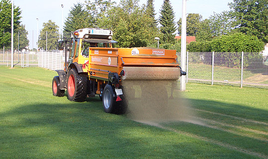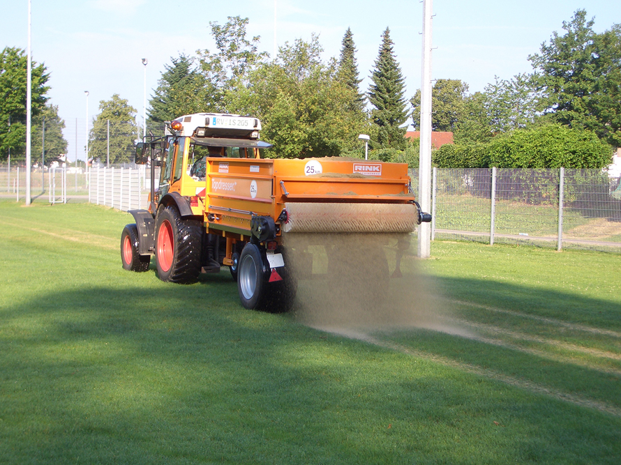Der RINK GS 1520 ist mit einem Ladevolumen von 2,0m3 und einer Arbeitsbreite von 1,45m der am Häufigsten eingesetzte Bürstenstreuer zur professionellen Rasenpflege im Golf- und Sportplatzbereich. Die Geschwindigkeit des Transportbandes und der Bürste kann unabhängig voneinander stufenlos eingestellt werden, wodurch die Maschine vielseitig einsetzbar ist. Der Bürstenstreuer wird seit vielen Jahren zum Neuaufbau, zur Sanierung oder zur Unterhaltspflege verwendet.Die hohe Ladekapazität ermöglichtet bei einer Streudicke von 3,0mm eine Bahnlänge von 452m. Die Bürstenwalze streut den Sand direkt auf den Grund der Rasendecke, somit wird der Spielbetrieb nicht eingeschränkt und die Messer der Spindelmäher werden weniger stumpf. Das niedrige Leergewicht der Maschine und die breite Spezialbereifung ermöglichen einen sehr geringen Bodendruck.