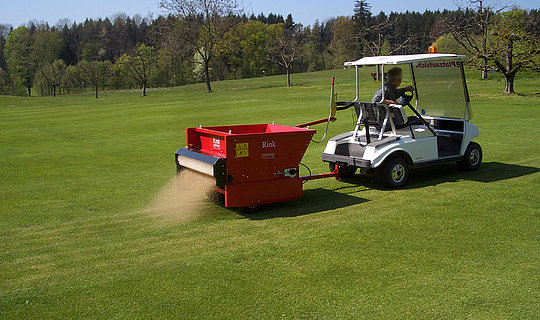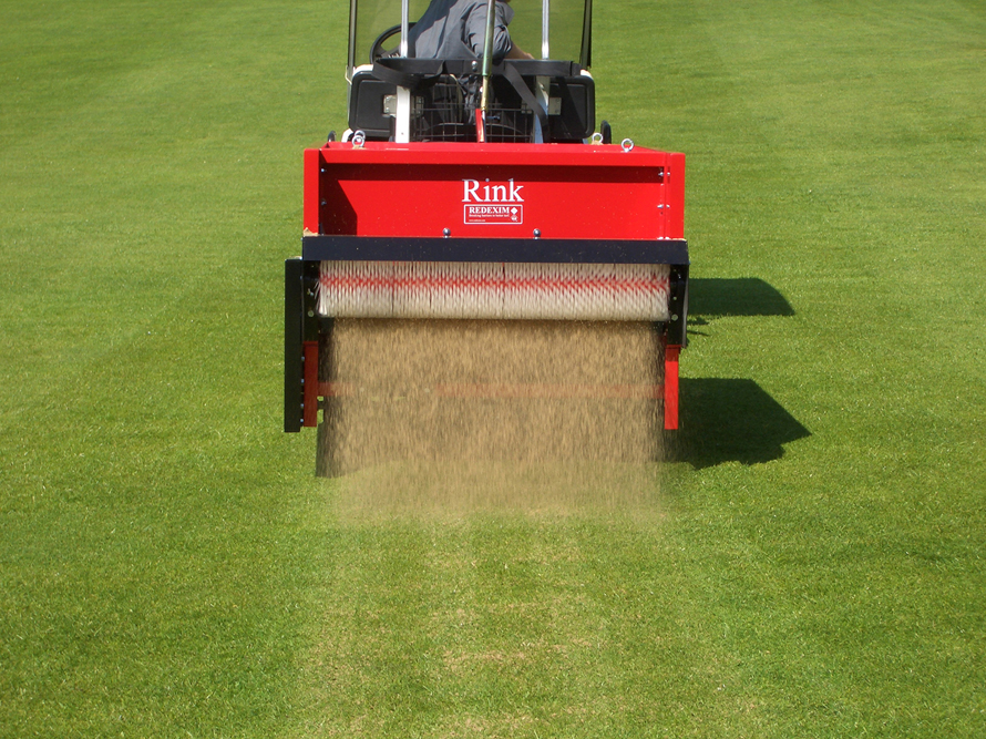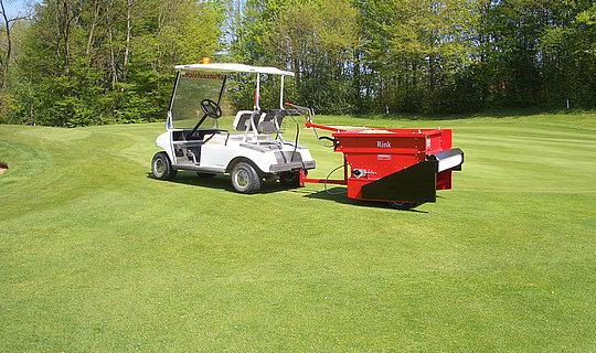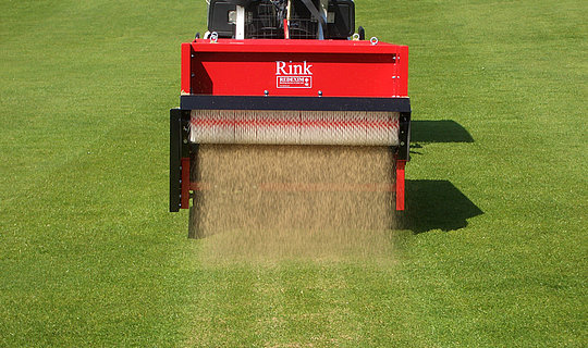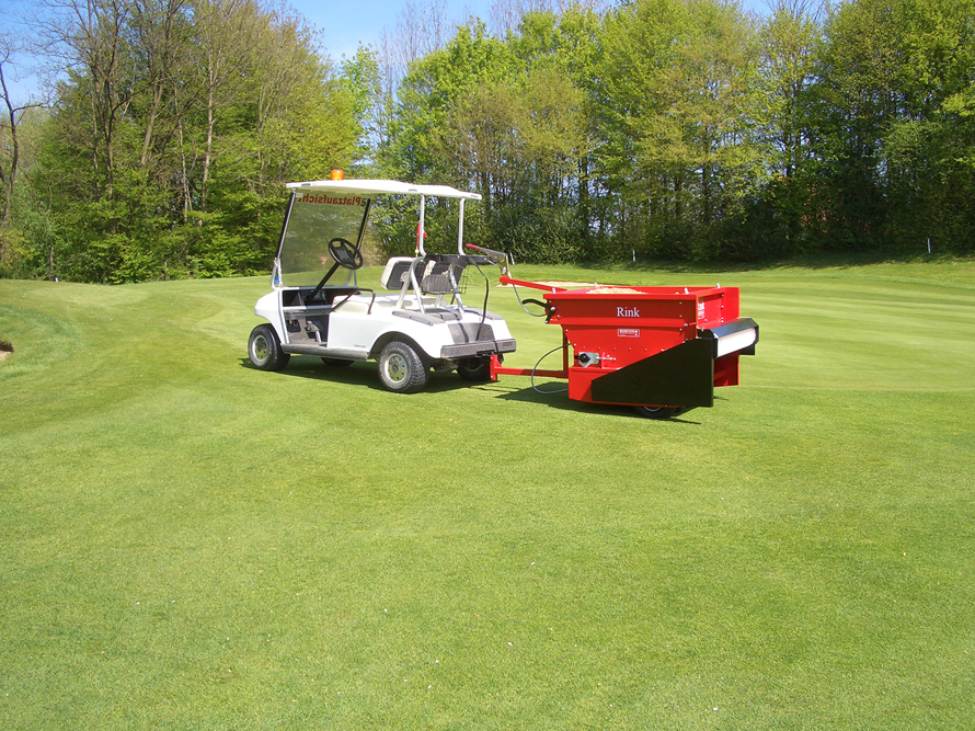 Der RINK TB 950 ist ein gezogener Bürstenstreuer der nahezu von jedem beliebigen Fahrzeug gezogen werden kann. Der Besander verfügt über ein Ladevolumen von 0,33m3 und einer Arbeitsbreite von 0,95m. Der Antrieb erfolgt wahlweise mit Vierrad- oder Zweiradantrieb. Die Streueinrichtung des RINK TB 950 wird über Keilriemen und Ketten angetrieben. Die Streudicke bzw. Streumenge wird über einen mechanischen Schieber eingestellt. Das Streugut kann somit genau dosiert werden. Diese Maschine eignet sich ideal zum Besanden von Greens und Tees oder zum Auftragen der Tragschicht auf Tennisplätzen.