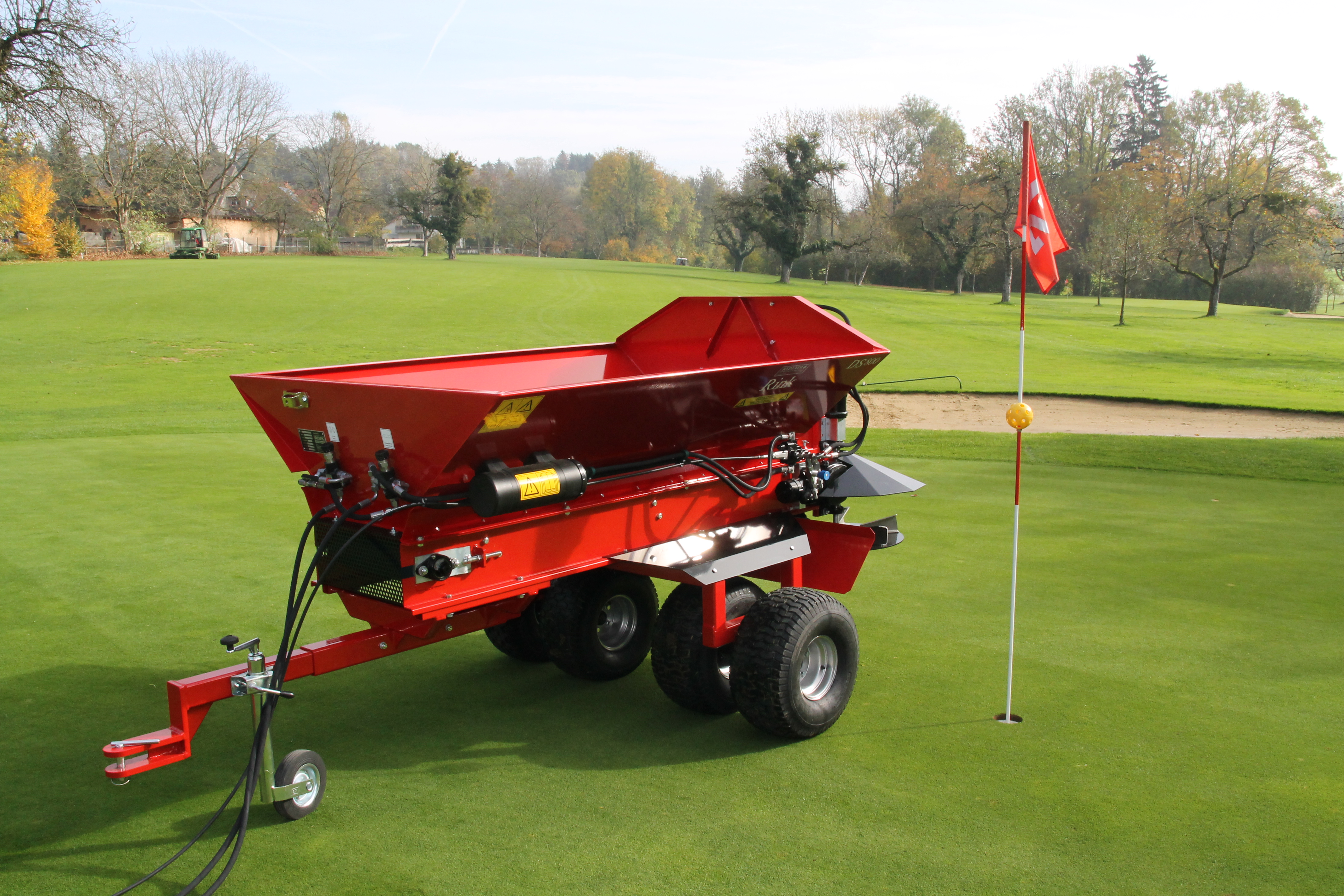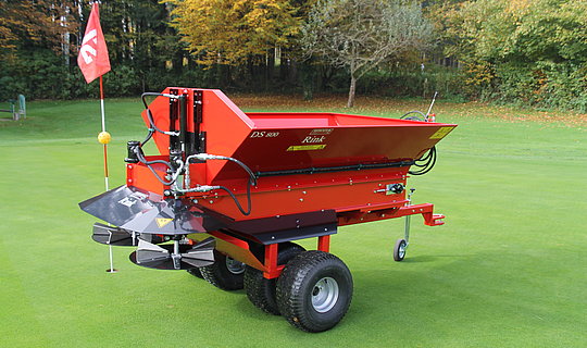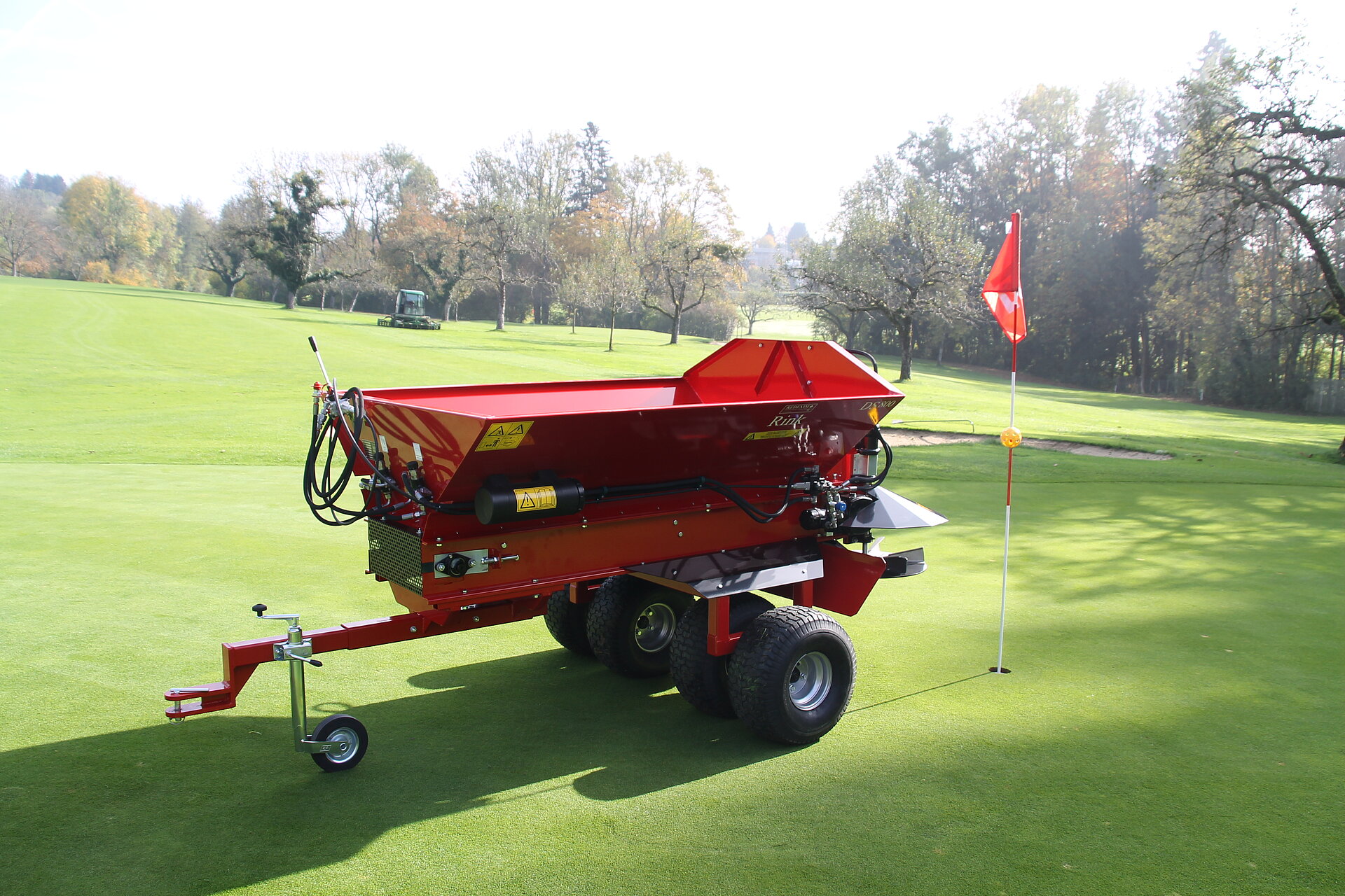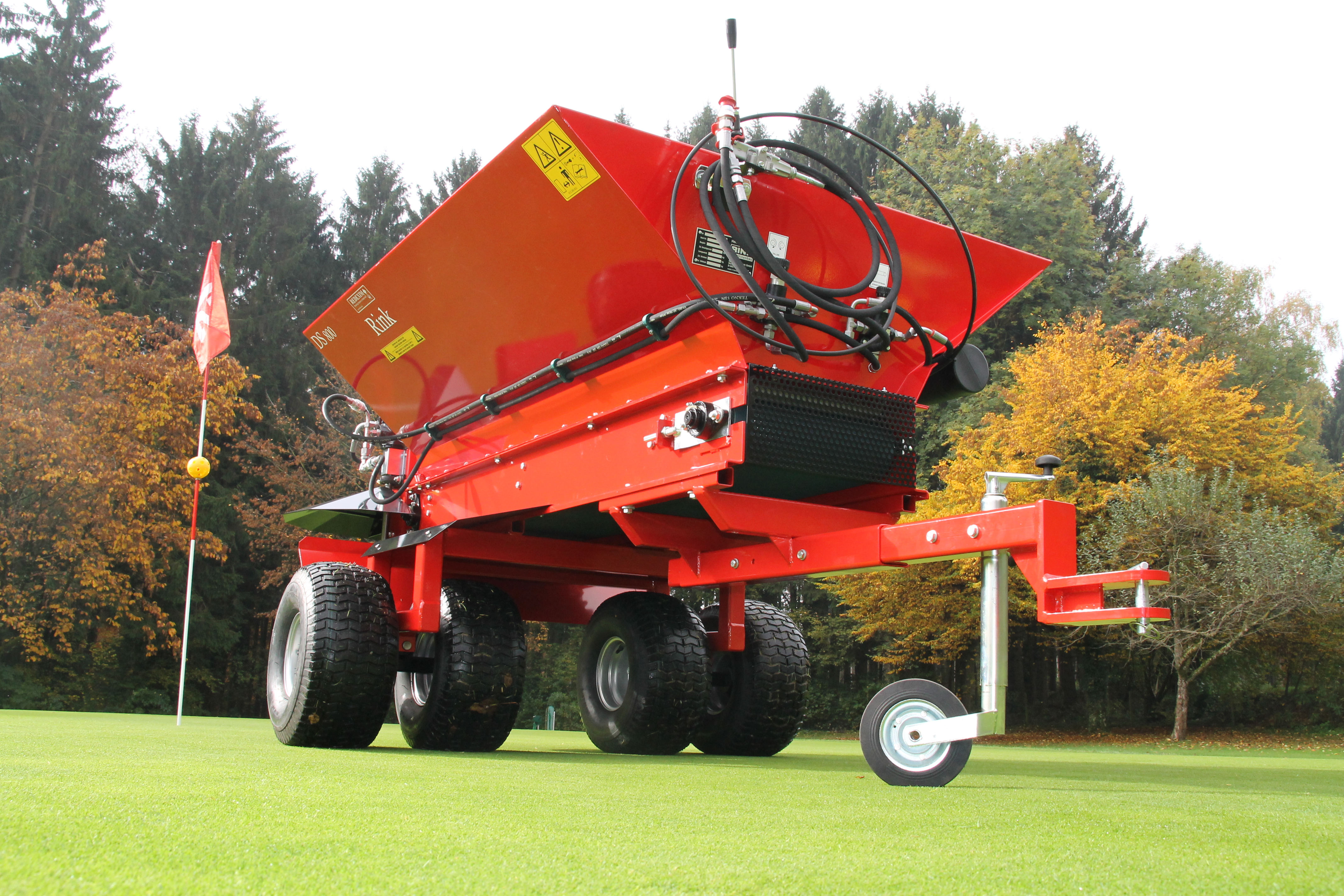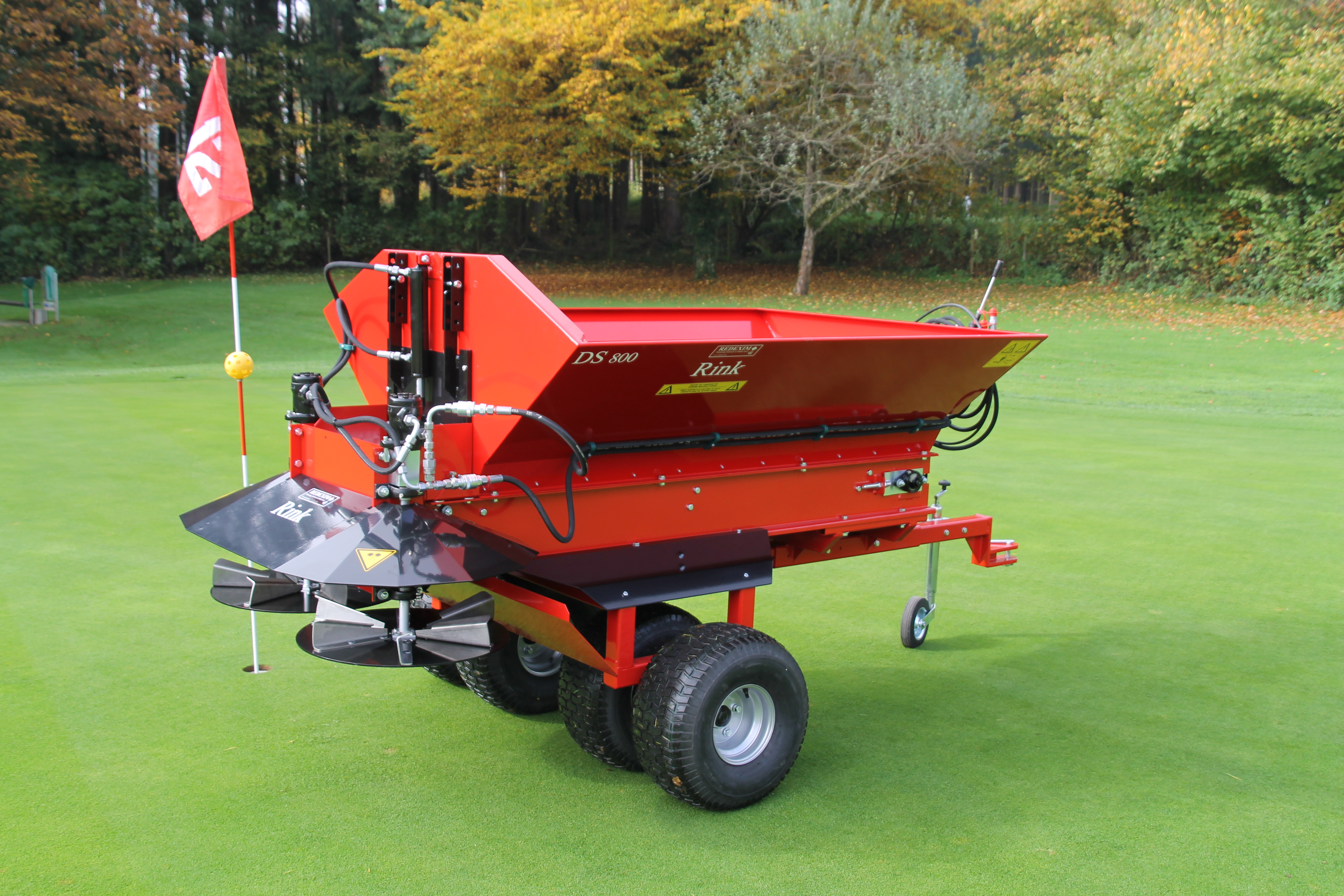 Der Tellerstreuer RINK DS 800, mit einem Ladevolumen von 0,8m3, eignet sich perfekt zum feinen aber auch kräftigen Besanden auf Golfplätzen. Dieses Modell gibt es als gezogene Variante RINK DS 800PB undals Aufsetzbesander RINK DS 800TM. Die gezogene Variante verfügt über eine 4-fach Pendelbereifung.