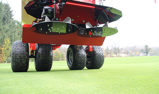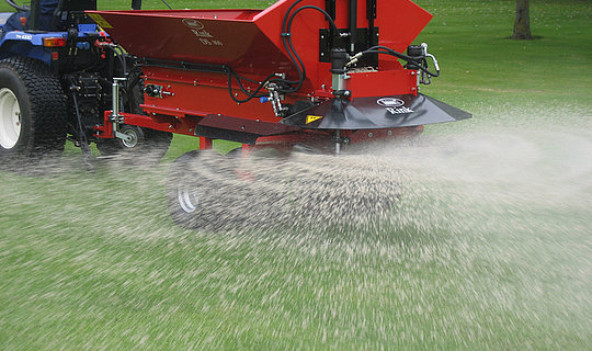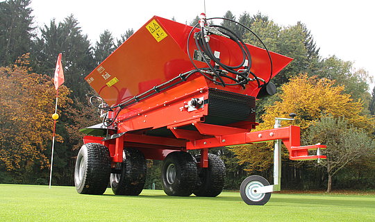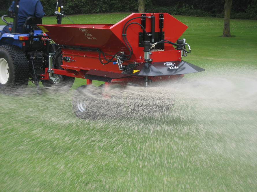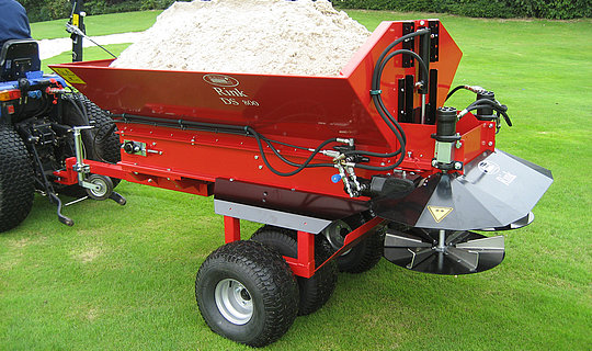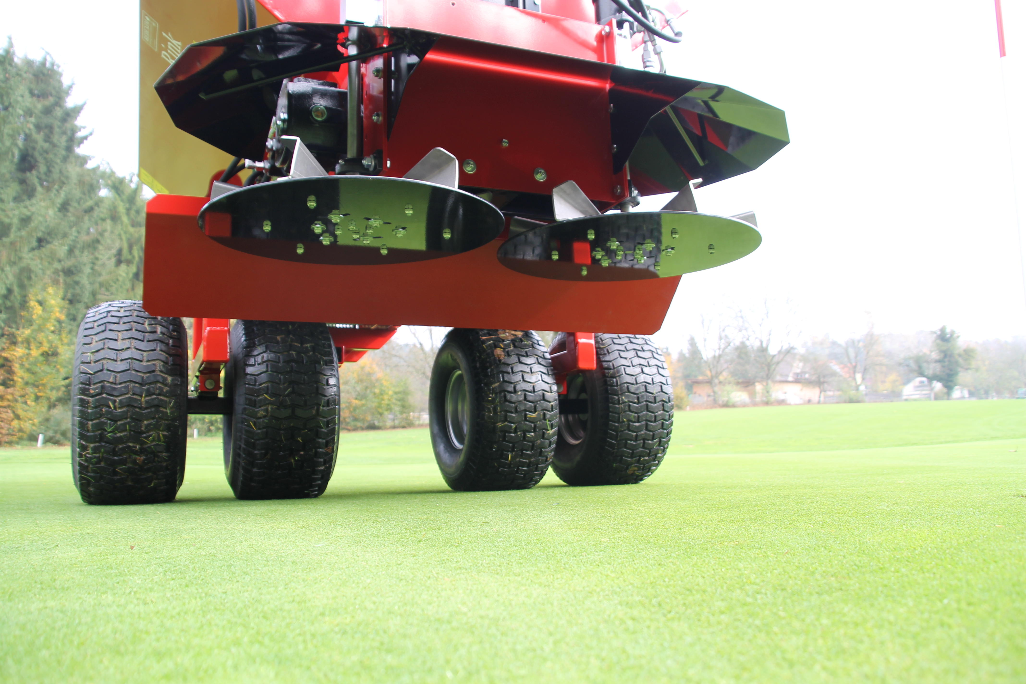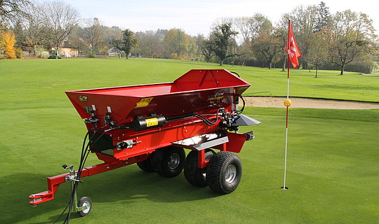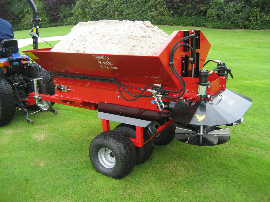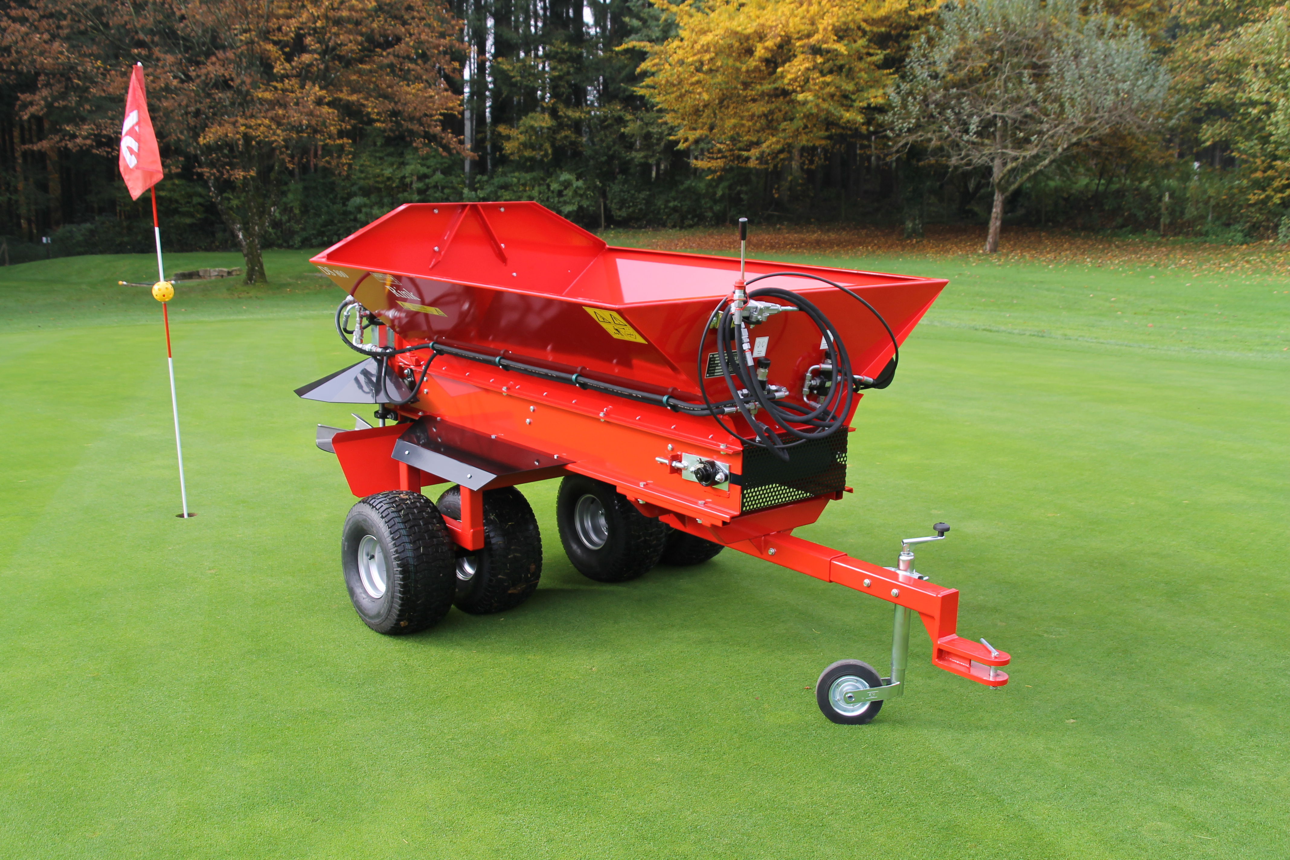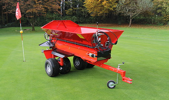 Der Tellerstreuer RINK DS 800, mit einem Ladevolumen von 0,8m3, eignet sich perfekt zum feinen aber auch kräftigen Besanden auf Golfplätzen. Dieses Modell gibt es als gezogene Variante RINK DS 800PB undals Aufsetzbesander RINK DS 800TM. Die gezogene Variante verfügt über eine 4-fach Pendelbereifung.