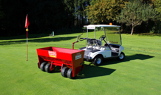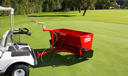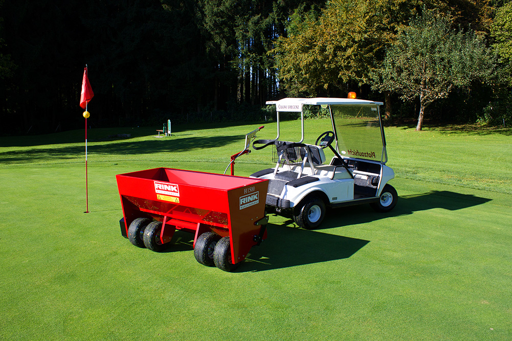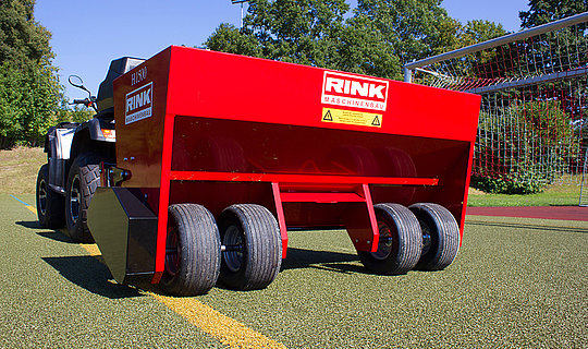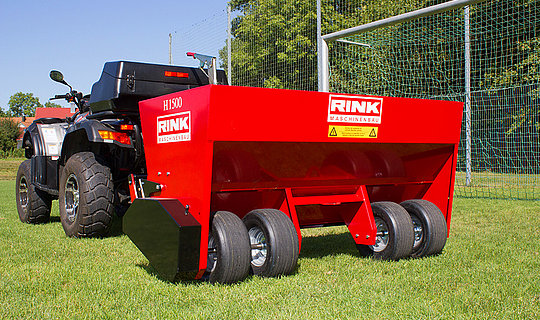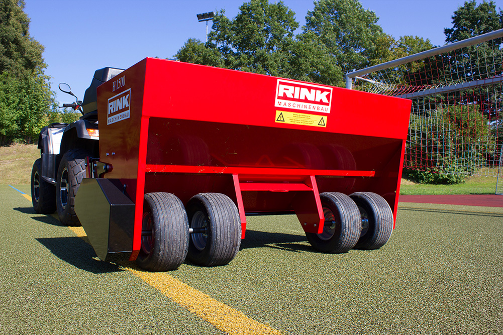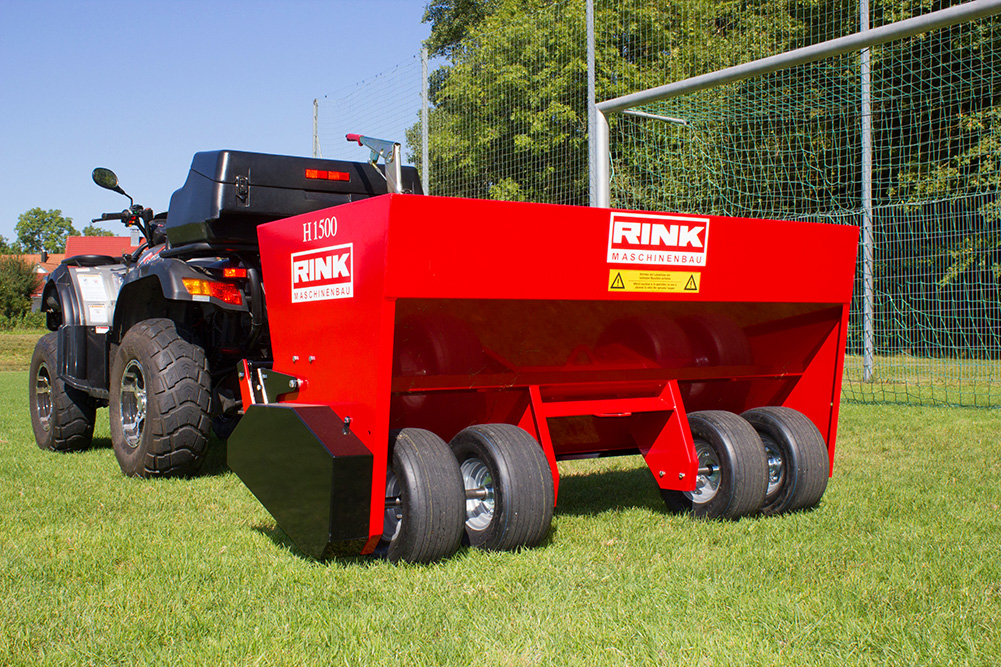 Der RINK H 1500 Walzenstreuer dient zum Streuen von feinkörnigem, losem Streugut wie Sand, Riesel, Granulat oder ähnlichem. Dieses Modell verfügt über ein Ladevolumen von 0,405m3 und einer Arbeitsbreite von 1,5m. Die mit einer Kette angetriebene Streueinrichtung des RINK Walzenstreuer H 1500 wird über einen Bedienhebel zugeschaltet. Dieser betätigt den Streuantrieb und öffnet gleichzeitig den mechanischen Schieber. Die Streumenge wird durch die Schieberöffnung und die Fahrgeschwindigkeit reguliert. Mittels eines Anschlages wird die Schieberstellung begrenzt. Die Streudicke bzw. Streumenge wird über einen mechanischen Schieber eingestellt. Das Streugut kann somit genau dosiert werden.
